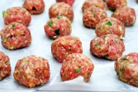 Using a small ice cream scoop, I use the Pampered Chef Medium Cookie Scoop. At $13, I use this ALL the time! You can also use a tablespoon to portion out turkey mixture in golf ball sized increments. Use clean hands to roll mixture into 20 meatballs and place on a parchment lined baking sheet. Bake untl lightly browned and cooked through, about 20 minutes.